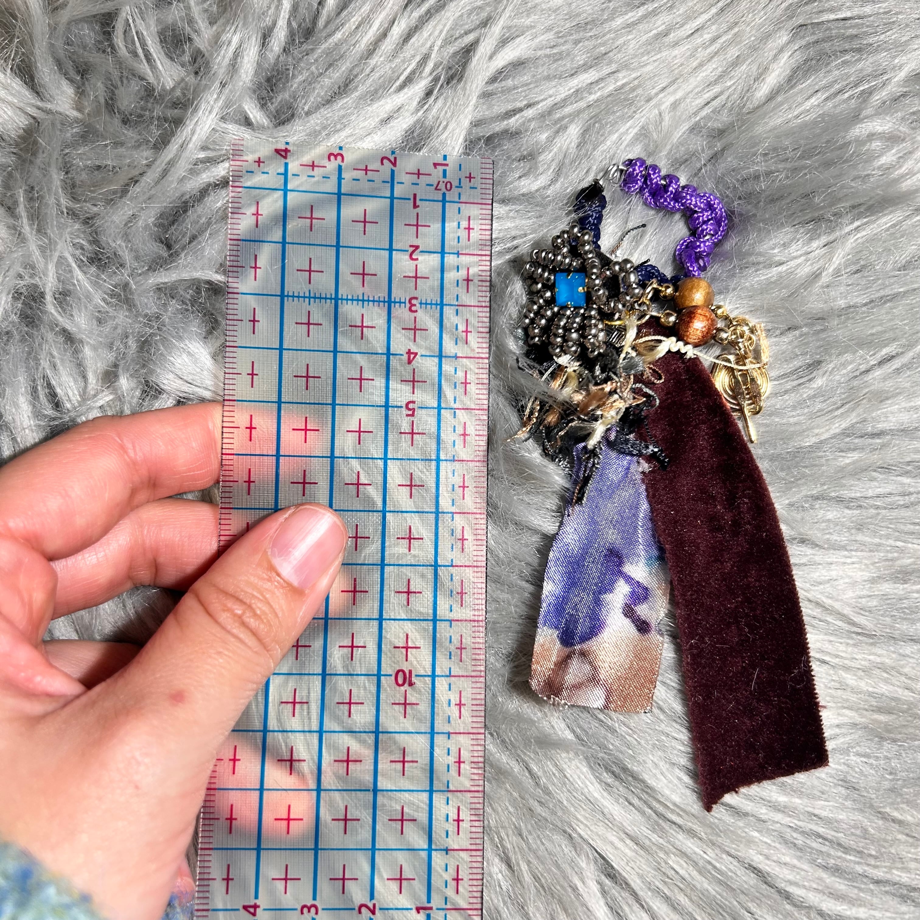 深いワインレッドのベロアリボンに、タイダイ風柄の柔らかい布、うずまきモチーフのパーツ、いろんな素材がふわっと混ざり合って、動くたびに優しく揺れるのがたまらないんです。豪華なのにどこか抜け感があって、重たく見えないのがすごいところ。