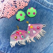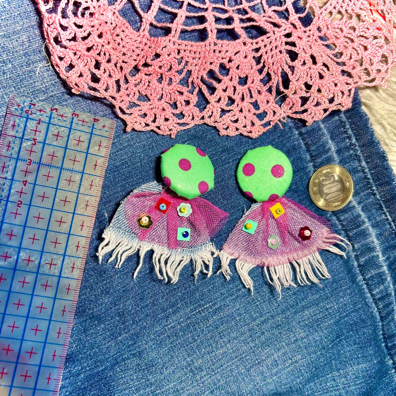 ドット模様に、布とビーズのおめかし。